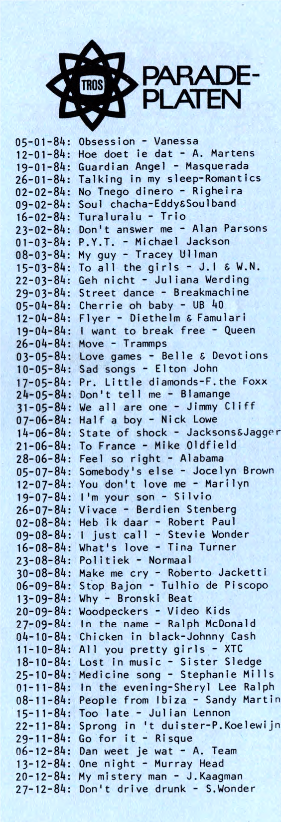 Tot slot van de nostalgische column even terug naar een overzicht van alle TROS Paradeplaten in het jaar 1984, dat destijds werd samengesteld door Ton van Draanen en gepubliceerd werd in het Freewave Media Magazine. Ik wens U een Zalig Kerstfeest en een prachtig 2026.