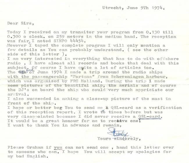While going through the archive, I also discovered a letter from Lothar Pinno in Germany, who tuned into RNI and Graham’s show for the first time in June 1973 and immediately felt compelled to write. He explained: