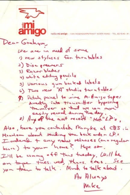 Others sometimes expected too much from the DJs, asking questions that simply could not be answered. One such example is a letter from Carol Richardson from London, who had previously lived in Maidstone, Kent. The letter made clear that several letters she had earlier sent to RNI had gone unanswered. “As I’ve sent several letters which weren’t dealt with, I’ll give it another try. I recently moved house and maybe that’s why I haven’t heard anything back. Anyway, I’m trying to find out who requested a song for me that was played on 19 May around two in the morning. My sister heard that some guy wanted to get in touch with me but only heard after the record that it was dedicated to me, and so she didn’t catch the name. Can you check who requested it?” As if the DJs had all those hundreds of incoming letters neatly filed by name to be able to retrieve such information instantly. No, Carol’s letter most likely ended up in a plastic bag that Graham took back to his home in Amsterdam—where I found the letter again decades later.